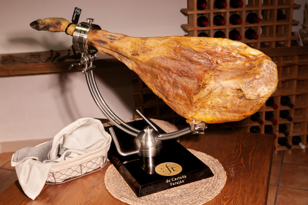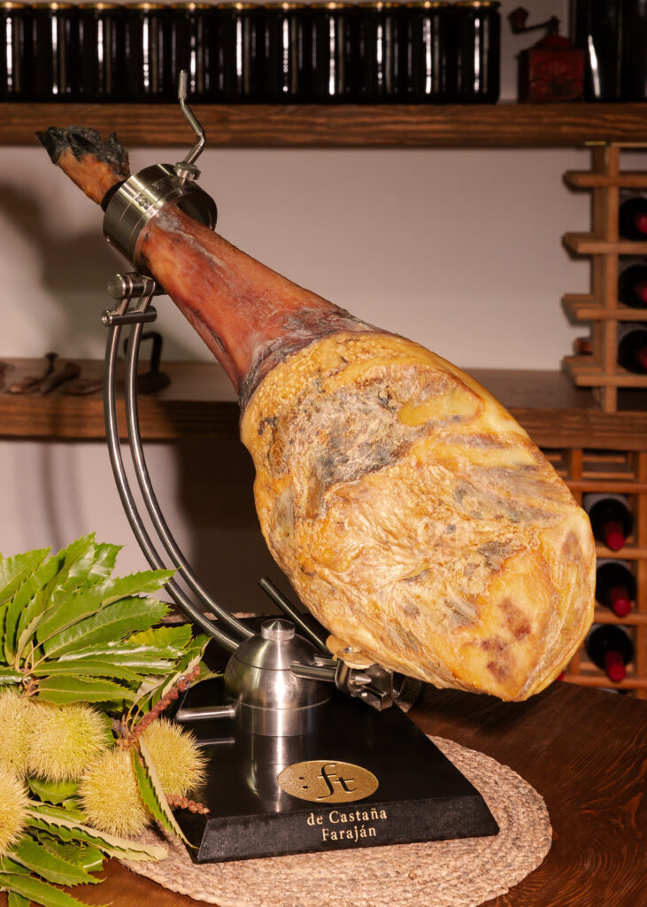 Cada loncha de jamón de castaña es una delicia para el paladar con su infiltración perfecta de grasa y su textura suave y jugosa